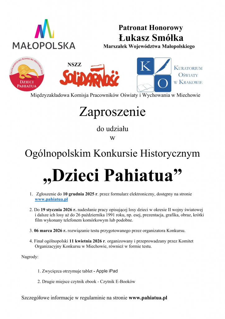 W dniu 27 stycznia 2026 r. uzyskaliśmy Patronat Honorowy Łukasza Smółki Marszałka Województwa Małopolskiego dla Ogólnopolskiego Konkursu Historycznego ,,Dzieci Pahiatua”